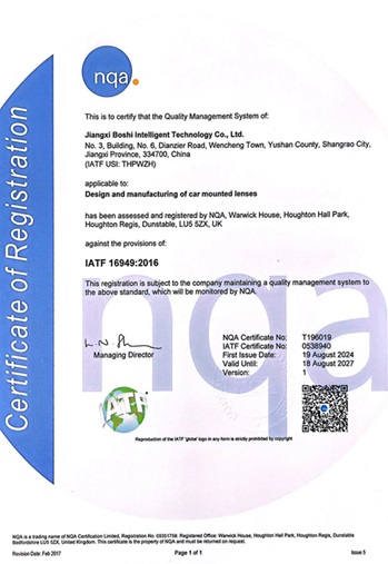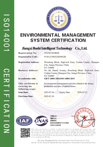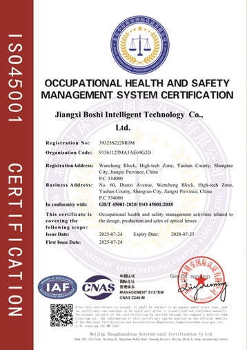 यह दर्शाता है कि बाओशी इंटेलिजेंस ने ऑप्टिकल लेंस अनुसंधान और विकास, विनिर्माण, बिक्री और बिक्री के बाद की सेवाओं की पूरी श्रृंखला को कवर करते हुए एक मानकीकृत प्रबंधन प्रणाली स्थापित की है, जो उच्च गुणवत्ता वाले उत्पादों और सेवाओं के निरंतर प्रावधान के लिए एक ठोस आधार रखती है।